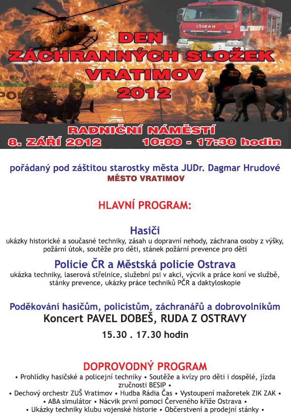 Stejně jako v loňském roce organizujeme pod záštitou paní straostky v sobotu 8. září 2012 od 10:00 do 17:30 Den záchranných složek Vratimov 2012 na Radničním náměstí.