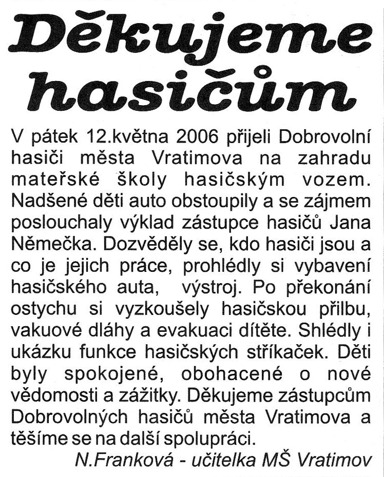 Děkujeme hasičům (ukázka v MŠ), Vratimovské noviny, 1.6.2006