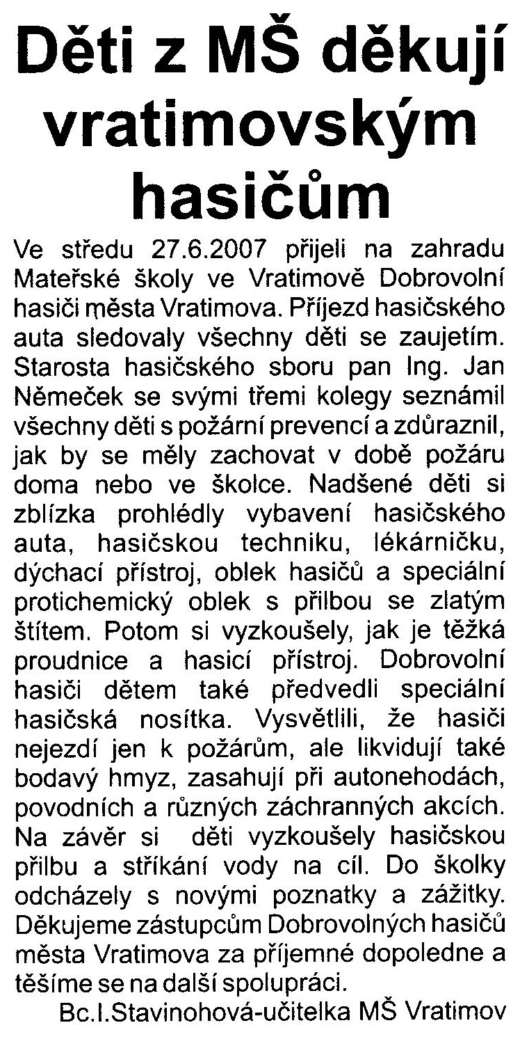 Děti z MŠ děkují vratimovským hasičům, Vratimovské noviny, 1.9.2007