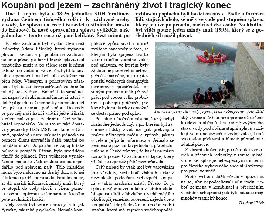 Koupání pod jezem - zachráněný život ..., Vratimovské noviny, září 2010