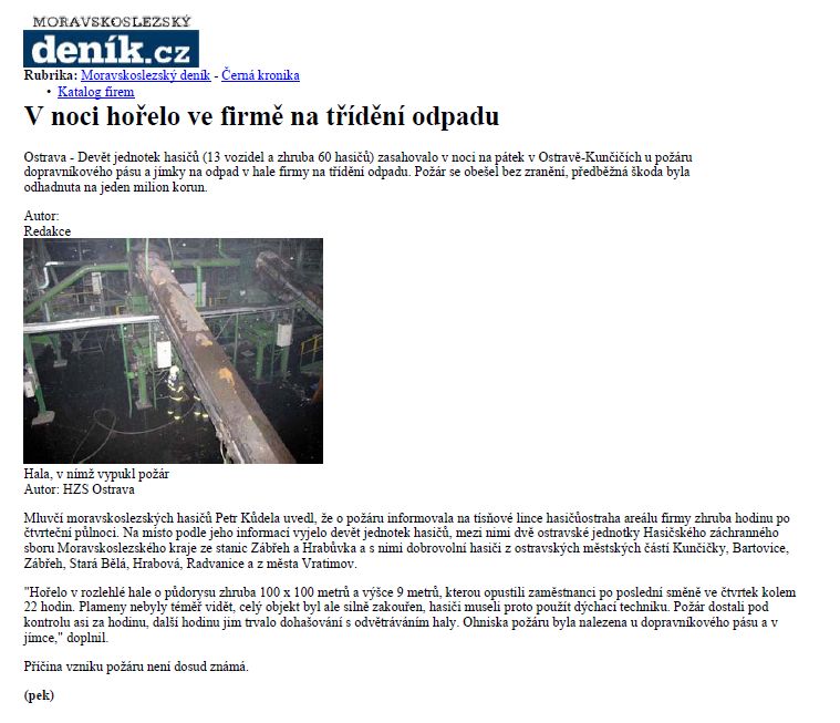 V noci hořelo ve firmě na třídění odpadu, MS Deník, 8.5.2009