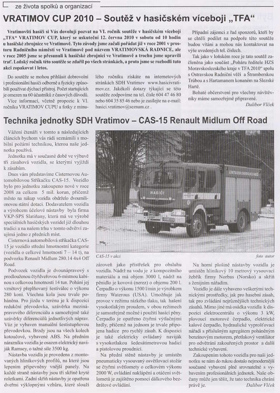 VRATIMOV CUP 2010, Technika SDH Vratimov, Vratimovské noviny, červen 2010