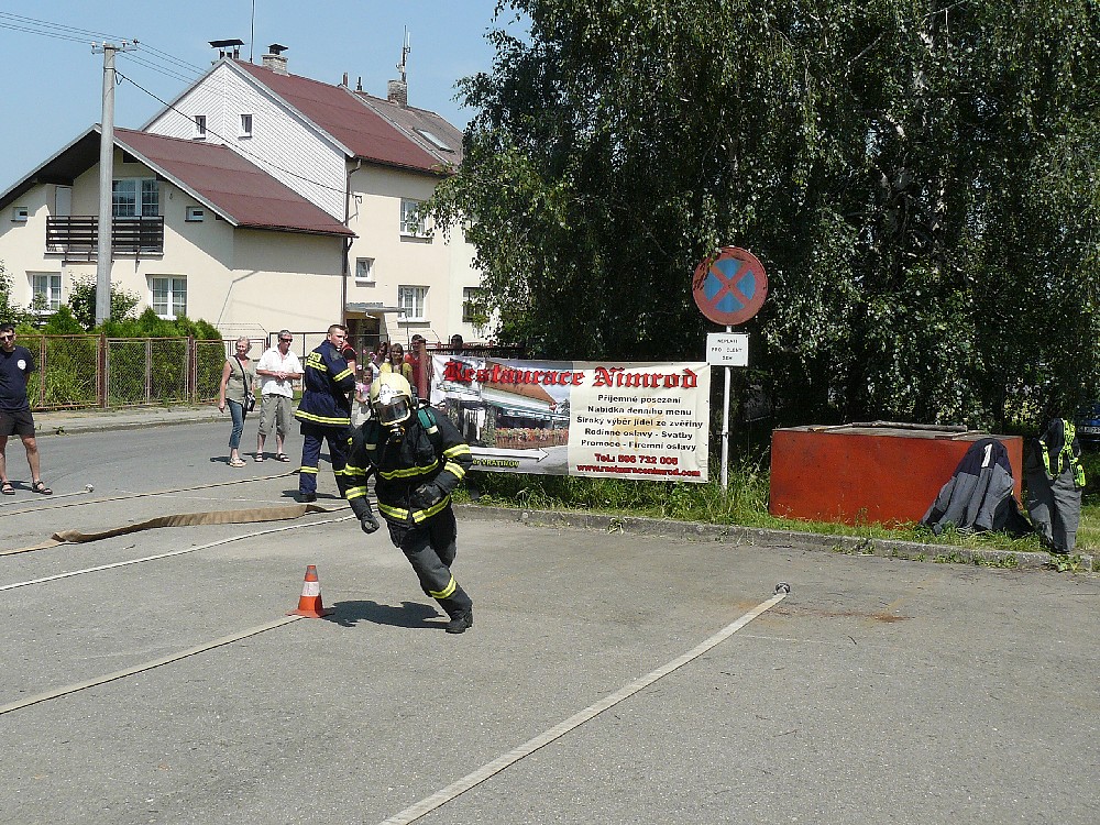 No a do třetice jsme si vybrali soutěž v Rýmařově. Je to sice daleko, ale tradice naších předchůdců se musí dodržovat. Bohužel i tady jezdí čím dál méně družstev a to i přes velice krásné prostředí a celkovou pohodu. Počasí nestálo za nic, déšť, zima a to byl červenec. Nastoupili jsme na start prvního útoku, který byl hladký bez překážky. Nebylo to špatné a nakonec jsme docílili času, který stačil až na 7. místo. Druhý útok byl z kolejnicí na první B hadici. Bohužel došlo k rozpojení béčka u rozdělovače a k velké časové ztrátě. Útok jsme dokončili, ale na posledním místě.